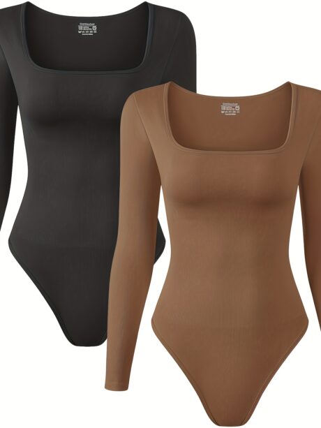 2 Pieces Of Women’s Sexy Ribbed Bodysuit, Square Neck Slim Long Sleeve Stretch Bodysuit, Versatile And Stylish Basic Top