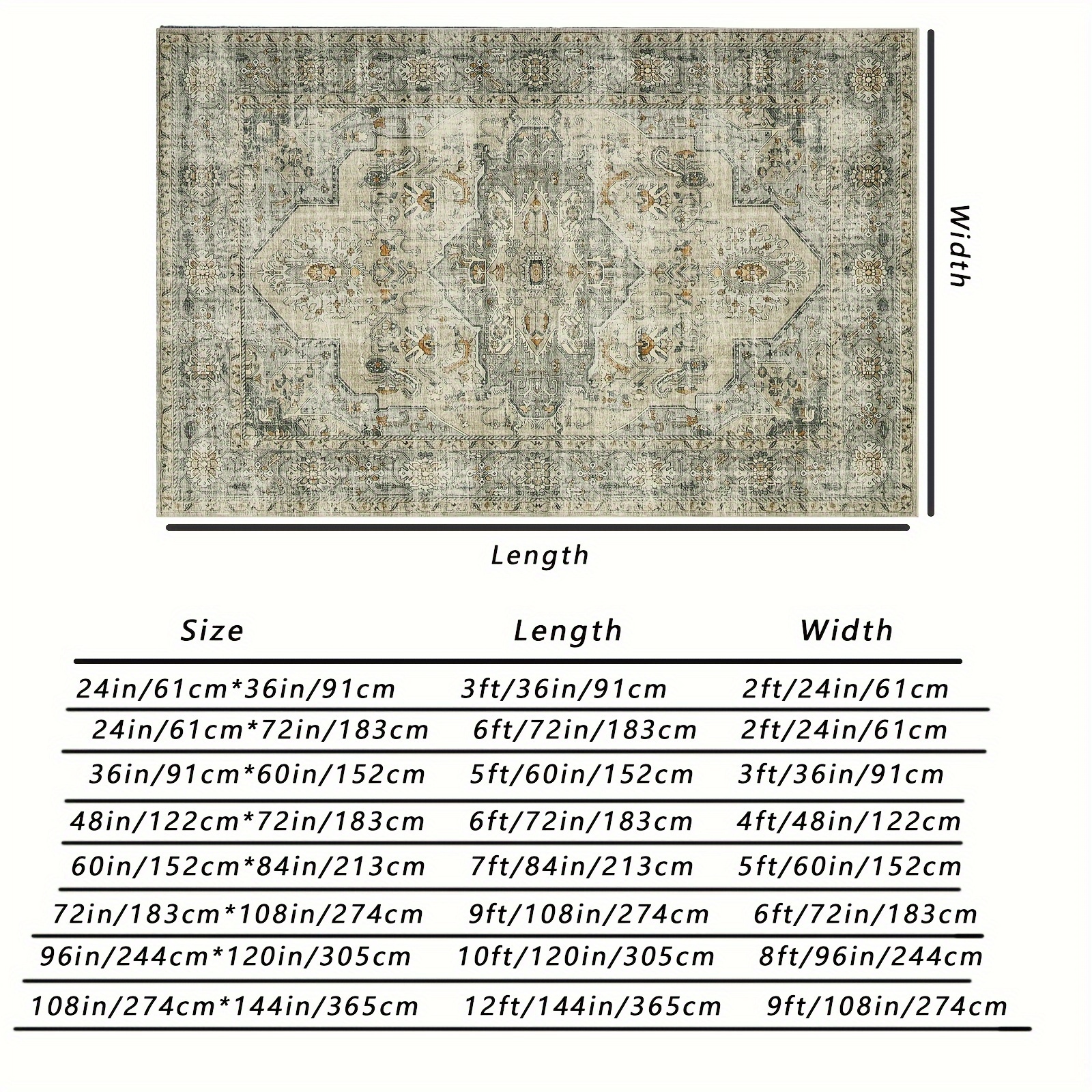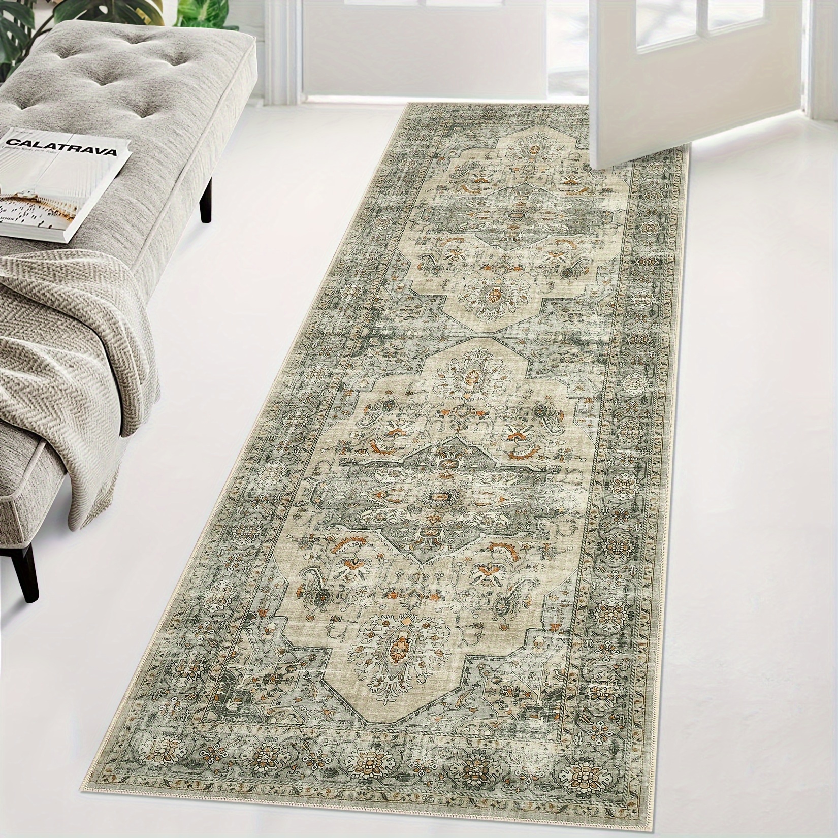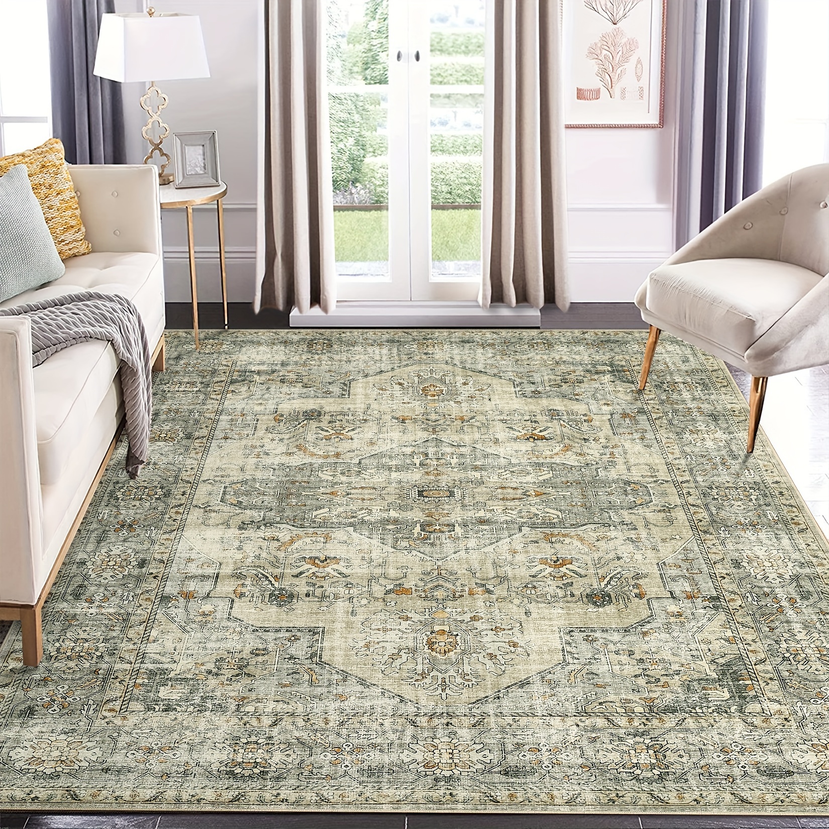 1PC Ultra-Thin Boho Traditional Soft Floral Oriental Rug For Living Room Indoor Traditional Soft Floral Oriental Rug Washable Medallion Distressed Design Bedroom Stain Resistant Area Rug Low Pile Throw Carpet Home Decor Farmhouse Beige