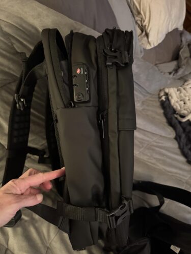In addition to the main compartment, there are several useful smaller internal and external zippered pockets, padded laptop compartment, and small elastic pouch sized for a typical 17 oz. disposable water bottle. The laptop compartment has an internal USB-A cable that routes to external USB-A and USB-C ports, so you conveniently can charge devices from the laptop or a power bank inside the backpack. It also has a TSA-approved lock with customizable combination, though given how the zipper pulls line up, it only will lock the laptop compartment, not the main one.